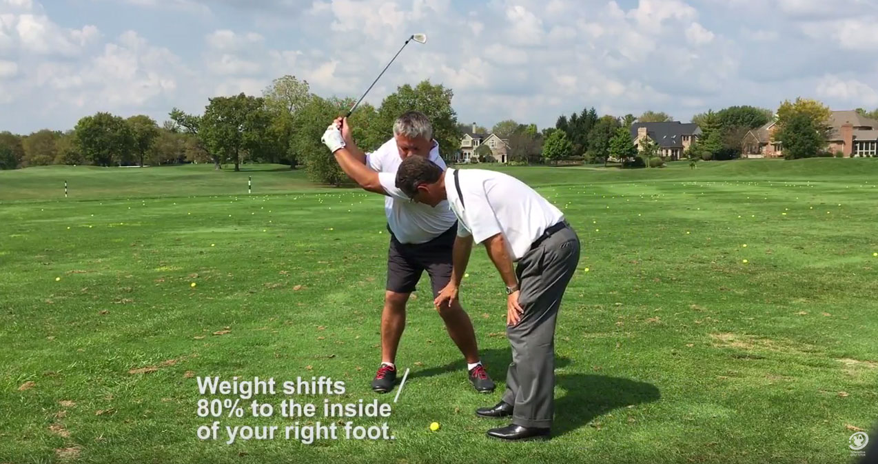 Your weight is now 80% on the inside of your right foot – this is similar to how a baseball player sets themselves in the batter’s box.