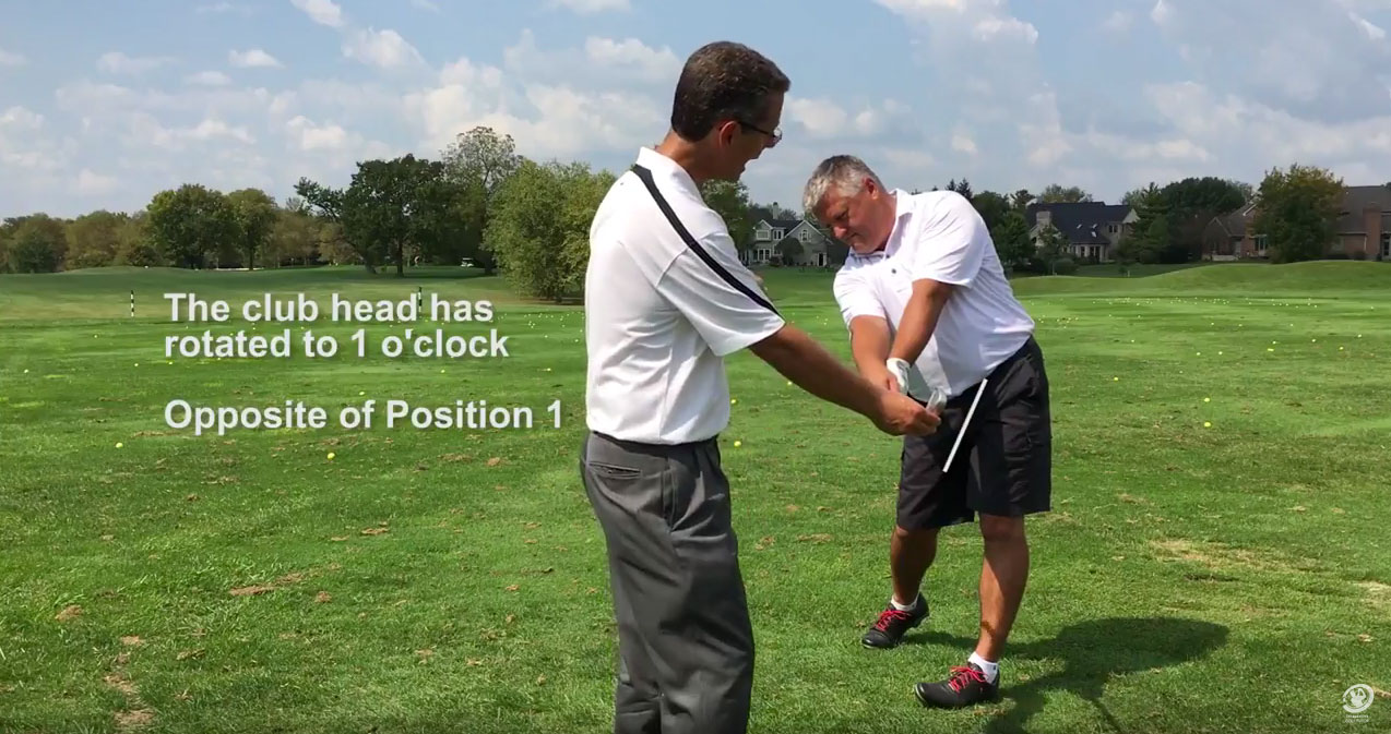 This is the post impact position. This is the mirror of position 2. The club should be parallel to the ground and parallel to your feet.